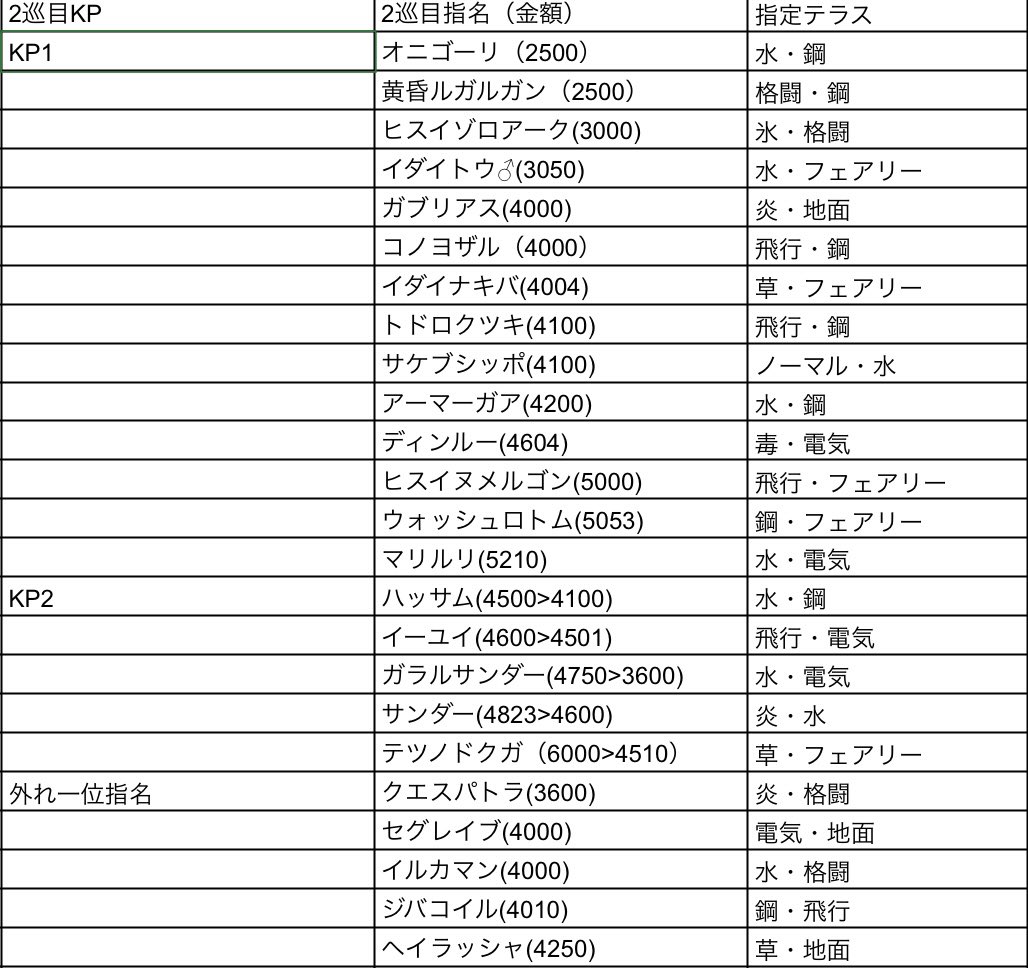 個人的にはルールで「2巡目までに指名されたポケモンは全員自由枠採用不可」というものがあったので最低4000pt以上のポケモンが数多く取られていったこの結果は微妙に感じた。(そもそも自由枠採用不可枠なので)