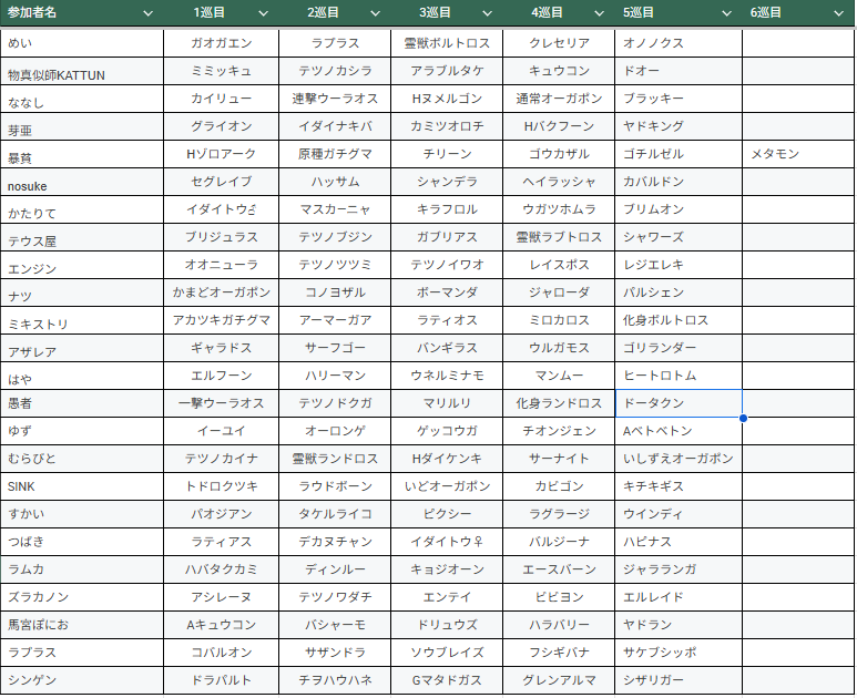 メタゲーム的にはコバルオンが望琉杯2のエキシビションで取ったこととサザンドラが一度TERA杯のゆずさん戦自由枠で使ったくらいで他は全員使うの初めて。オーダイルに至ってはマルチ会で少し使った以外は全然使ったことないと思われる。